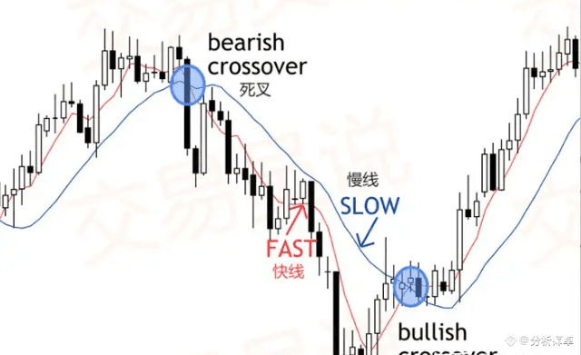 当在同一张图表上使用两个或多个均线指标组合时,就会出现慢(红色)和快(蓝色)移动平均线