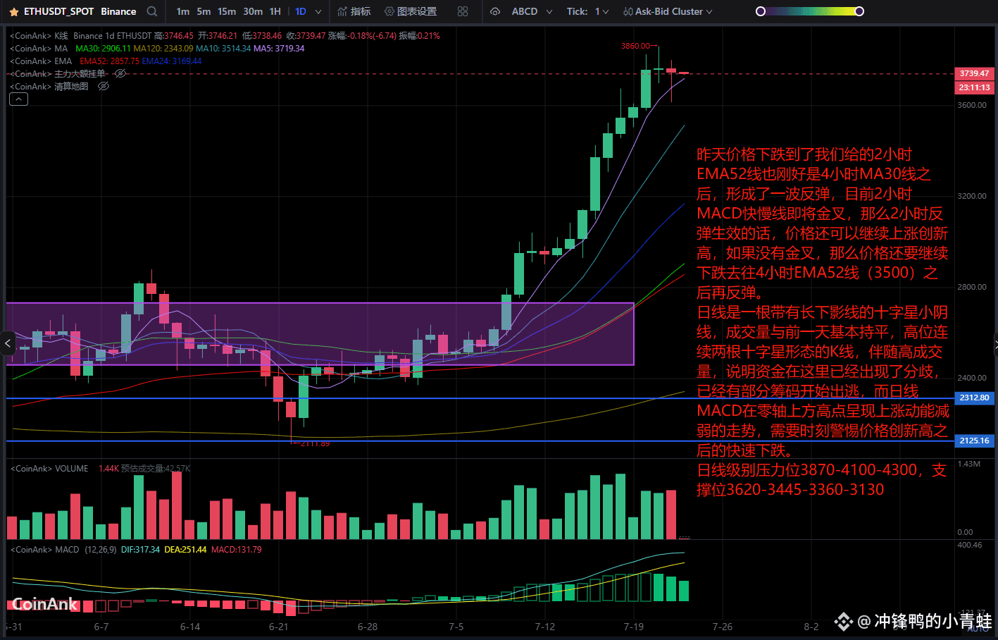 昨天价格下跌到了我们给的2小时EMA52线也刚好是4小时MA30线之后,形成了一波反弹,目前2小时MACD快慢线即将金叉,那么2小时反弹生效的话,价格还可以继续上涨创新高,如果没有金叉,那么价格还要继续下跌去往4小时EMA52线(3500)之后再反弹。