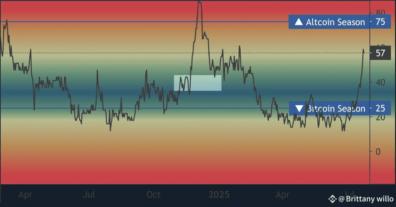 The Altcoin Season Index just made a massive vertical move from 25 to 57 — one of the sharpest jumps we've seen in months.