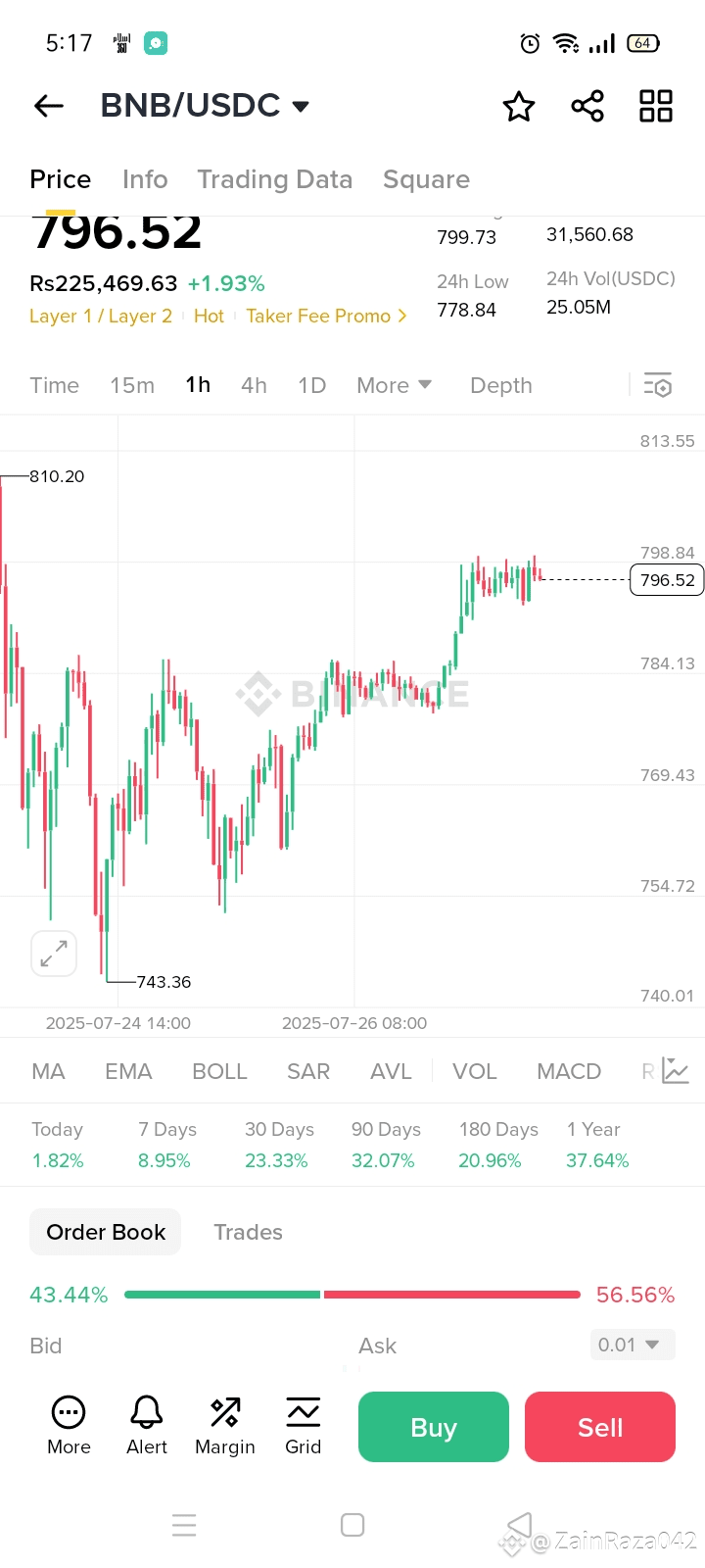 The sentiment is leaning bullish, with 56.56% of orders on the sell side vs 43.44% on the buy side, suggesting potential profit-taking at this resistance level. However, volume remains healthy and steady, giving confidence to buyers.