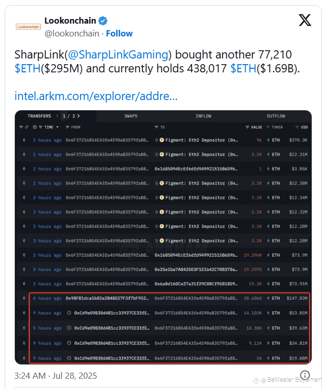 SharpLink currently holds 438,017 ETH $ETH , worth $1.69 billion, according to Lookonchain.