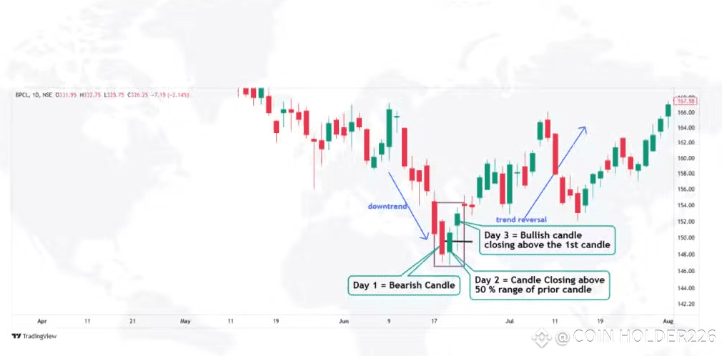 🔹The three inside-up candlestick pattern is a bullish reversal pattern that has three candles. First candle is a bearish one. The small second candle is bullish. Marking the trend change, the third candle is a strong bullish one.