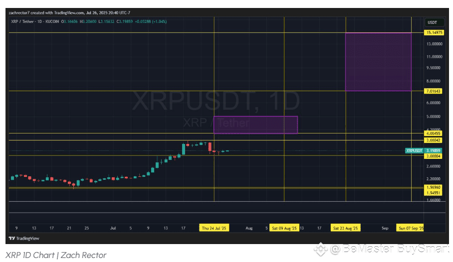 Meanwhile, Rector believes the $4 to $5 range will only be the starting point. The market pundit placed his second target region around the $7 to $15 price level. According to Rector, XRP will likely claim this $7 to $15 region by Sept. 7, 2025, six weeks from now.