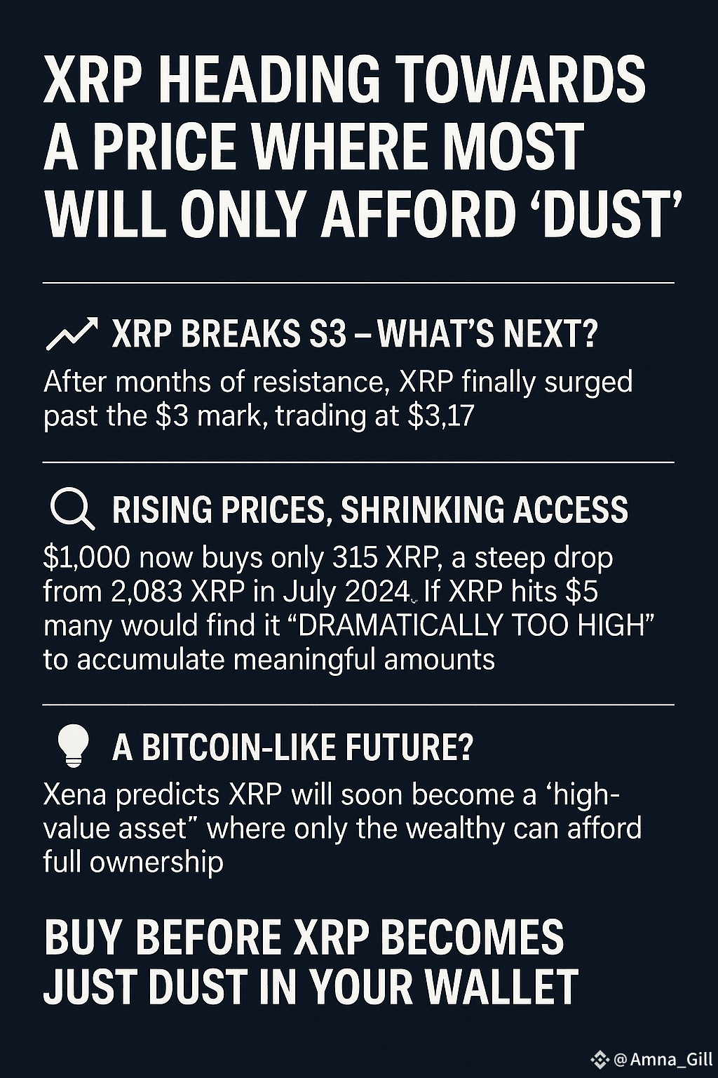 After months of resistance, XRP finally surged past the $3 mark, trading at $3.17 at the time of writing. In light of this milestone, Xena noted that $1,000 now buys only 315 XRP, a dramatic drop from the 2,083 XRP the same amount could fetch in July 2024 when the token was around $0.48.