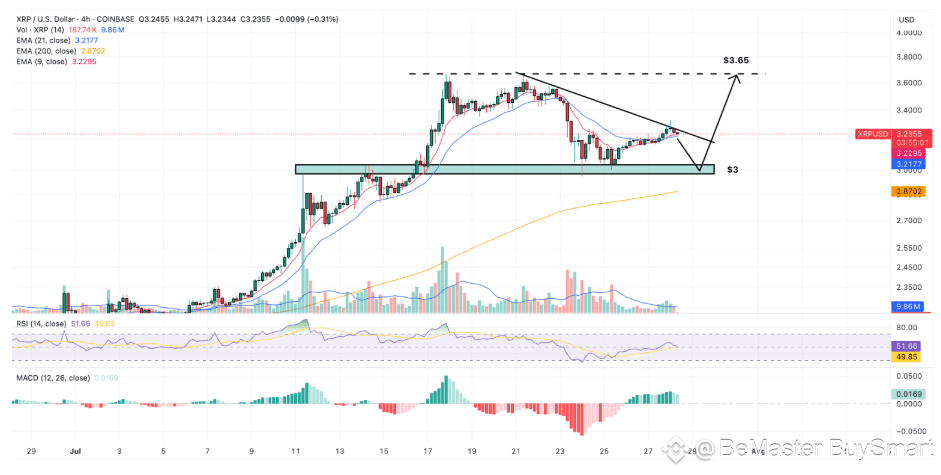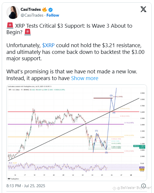 Trader CasiTrades shared her outlook on X, noting that while XRP faced resistance at $3.20, the $3.00 level held firm — a promising sign for bullish continuation.