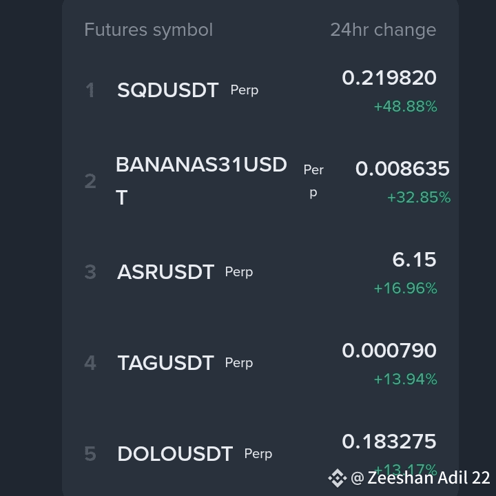 The following are the futures symbols with the strongest price increases over the past 24 hours. #SQD #BANNANA These coins have experienced notable upward $SQD momentum and have outperformed others in terms of percentage gains, reflecting significant bullish activity in the market during this period. #ARSUSDT