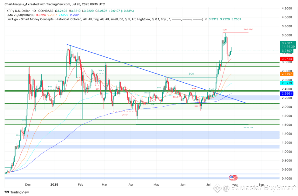 XRP $XRP is holding near the $3.25 level seen on July 28, after recording a significant technical breakout above the descending trend line that had stalled price action for over a year. The asset remains solid despite slight intraday declines, with key demand levels and derivatives inflows reinforcing the bullish outlook.