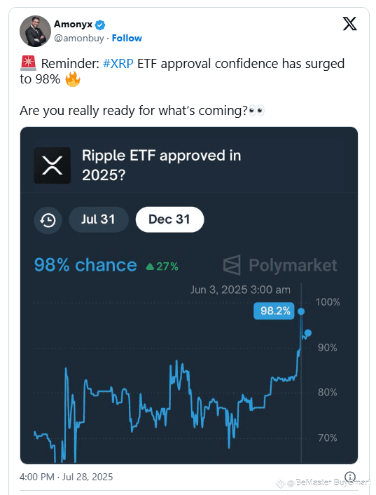 Additionally, there was a surge in momentum toward ETFs. According to data released by Amonyx on X, Polymarket indicates a 98% chance of the XRP ETF being approved by December 31, 2025. Compared to 80% earlier in June, this sudden rise in market sentiment may have been brought on by recent regulatory changes.