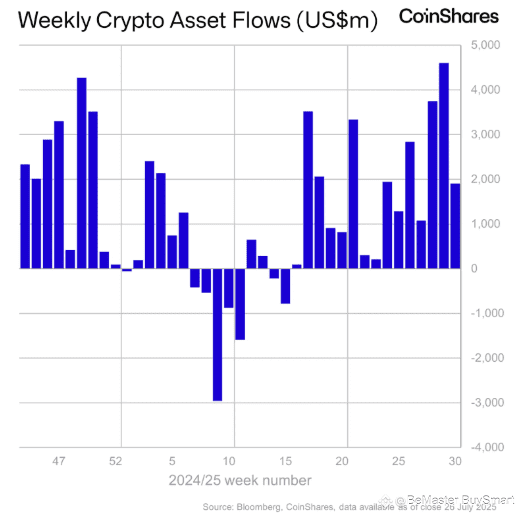 Digital asset investment products saw $1.9 billion in inflows this week, a 15-week run of positive sentiment, as reported by CoinShares. So far in July, inflows have hit $11.2 billion, outpacing the $7.6 billion recorded back in December 2024 after the U.S. election. The United States led the charge with $2 billion, while Germany contributed an additional $70 million. On the flip side, outflows from Hong Kong, Canada, and Brazil totaled $160 million, $84.3 million, and $23.2 million, which somewhat balanced out the demand from the U.S.