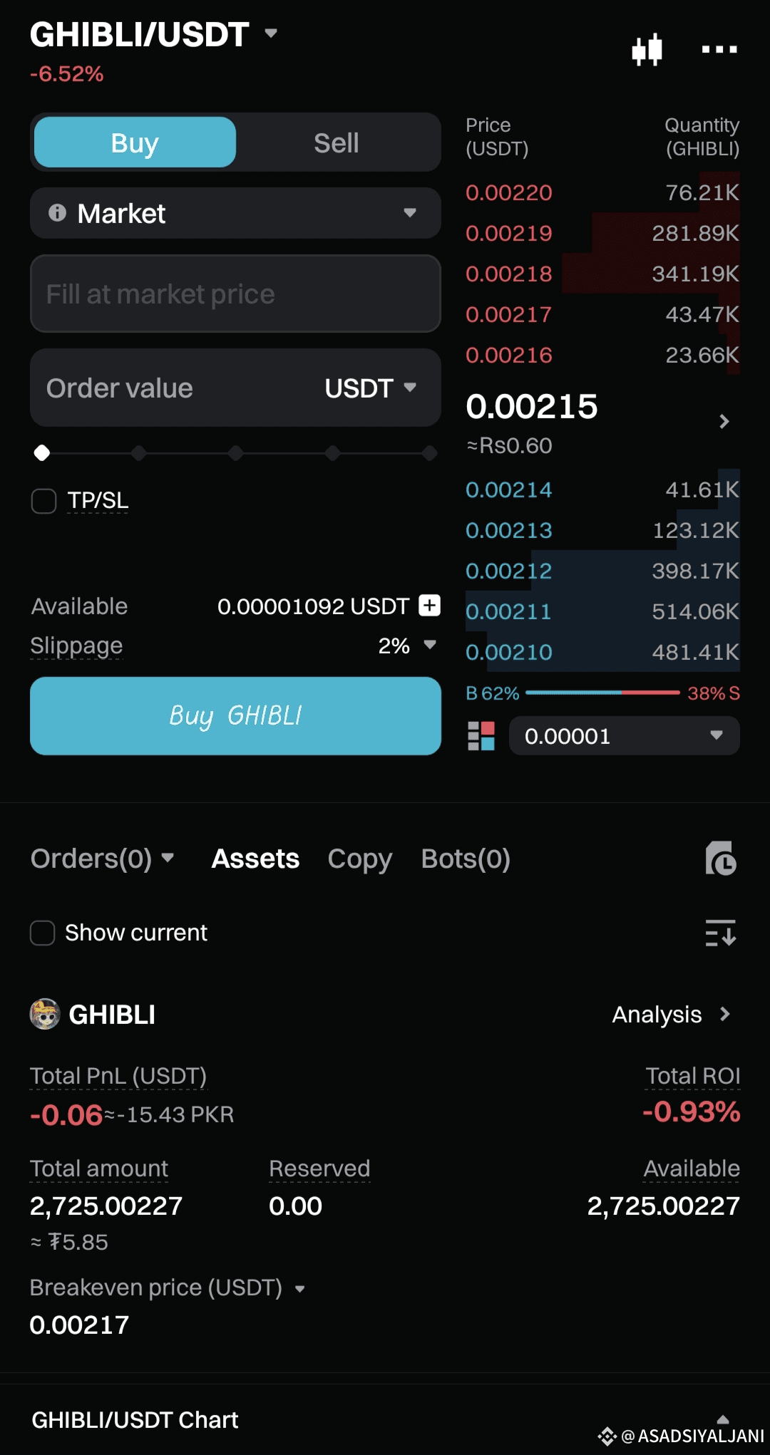 I'm currently holding 2,725 $Ghibli I tokens, bought at a breakeven price of $0.00217. Right now, the market price is around $0.00215, showing a slight unrealized loss of -0.93% (around -$0.06 / -Rs. 15.43).