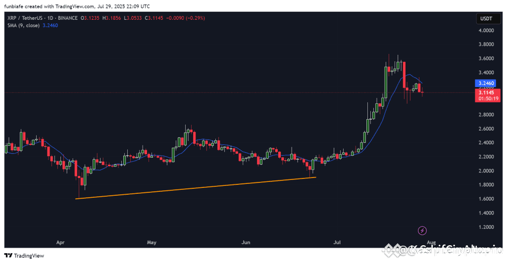 XRP is cooling off after its big breakout earlier this month. From a high of $3.70, it's now stuck around $3.11, with $3.00 acting as the last line of defense. Bulls are holding the fort — but barely.