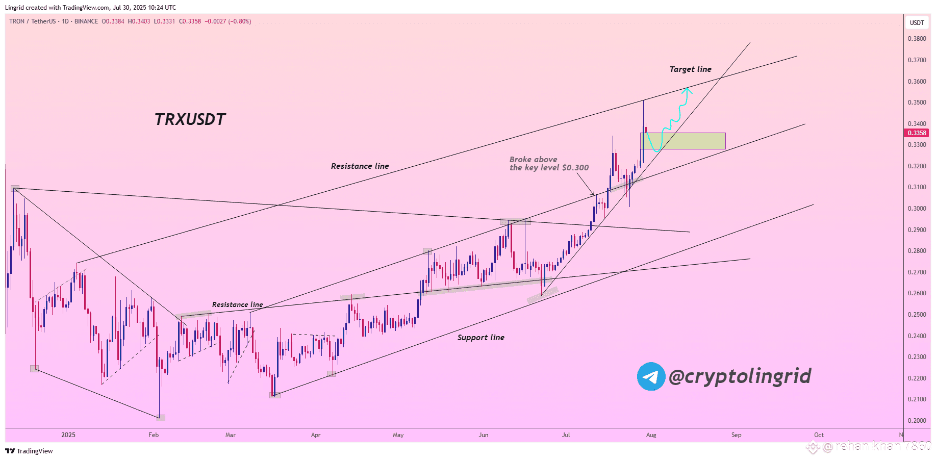 🔴 $TRX has formed a rising channel after breaking above a long-standing consolidation. A similar ascending structure in May led to a sustained uptrend after reclaiming resistance. The price is currently retesting the breakout zone near $0.330 as support within a rising wedge. If the trend holds, a push toward the upper boundary near $0.360 is likely.