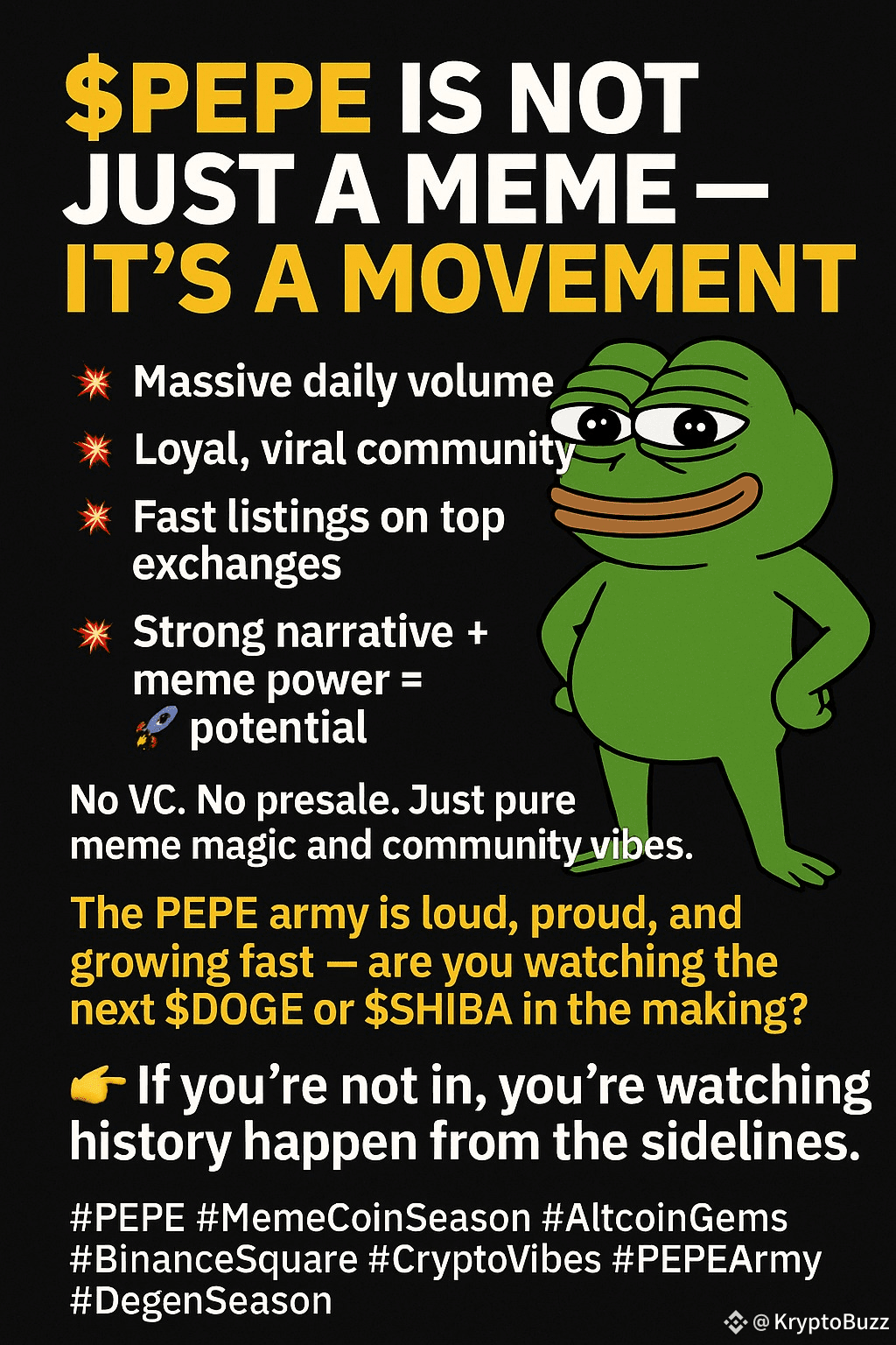 PEPE didn’t grow because whales pumped it. It grew because the community BELIEVES. The PEPE army is loud, proud, and unstoppable. From CT (Crypto Twitter) raids to memes that go global in minutes, the energy is unmatched.