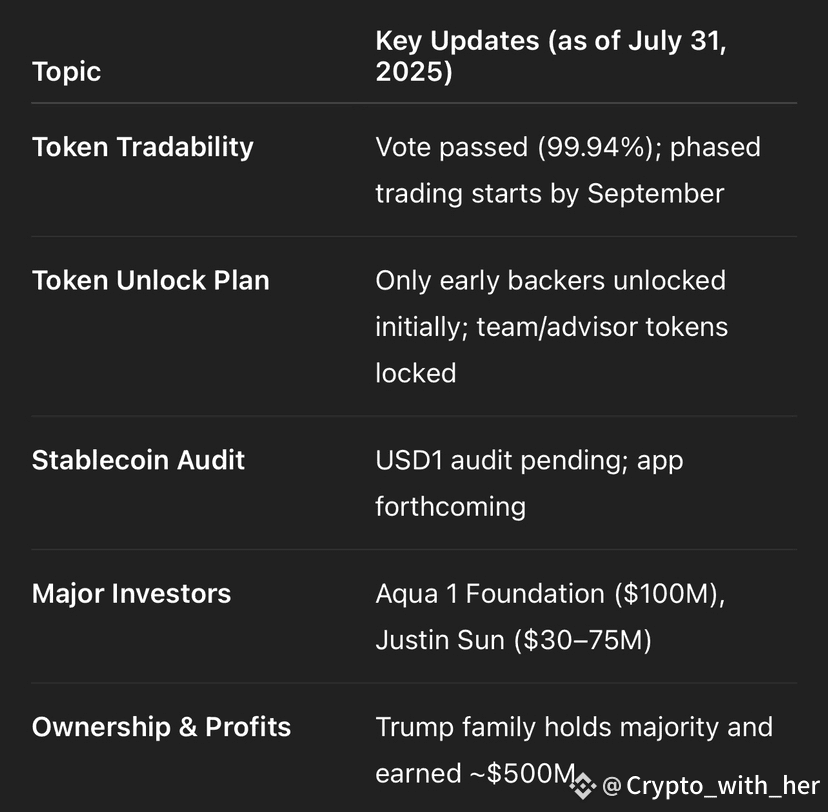 * ✅On July 16, WLFI token holders voted overwhelmingly—99.94% in favor—to allow the token to become tradable on secondary markets and peer-to-peer platforms.