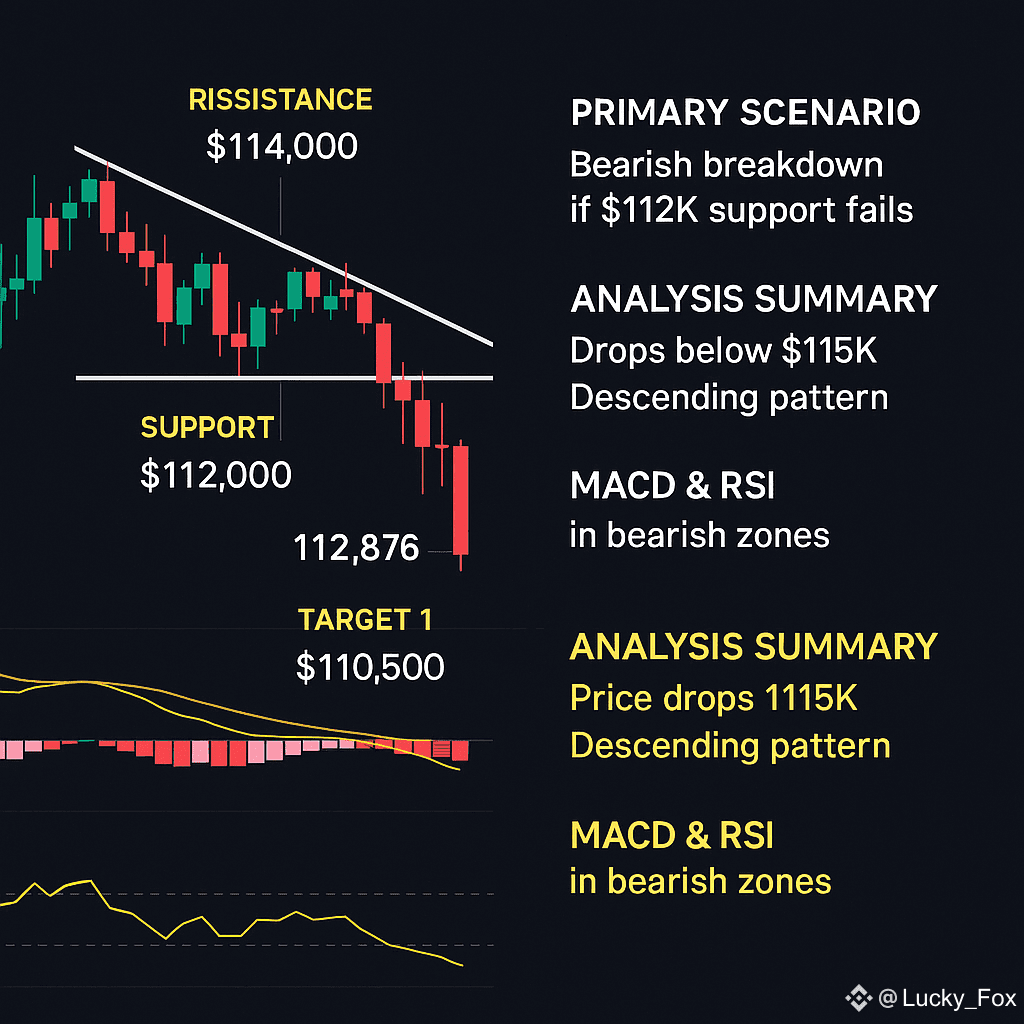 BTC has shifted into a bearish momentum phase after breaching key supports. While a bounce is possible, bearish continuation toward $110K remains the higher-probability scenario unless BTC reclaims $114K quickly with strength. Trade carefully and verify signals before entering positions.