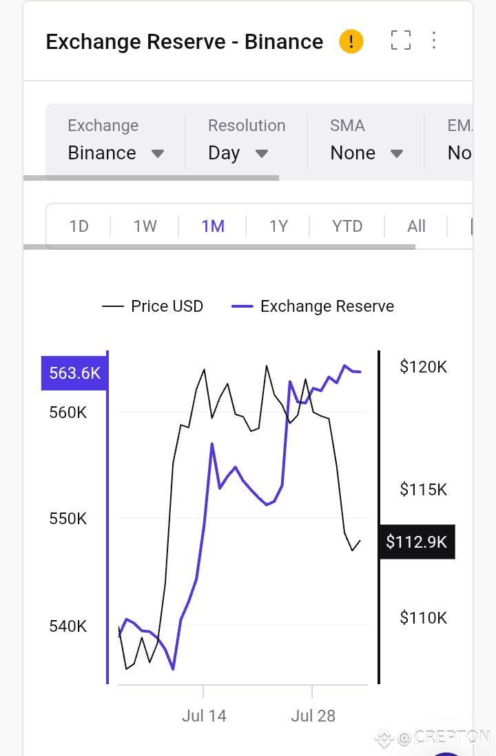 دعونا نلقي نظرة فاحصة على مؤشر "احتياطي الصرف" (Exchange Reserve) للبيتكوين $BTC على منصة باينانس خلال الشهر الماضي، ونحلل ما يمكن أن يخبرنا به عن اتجاهات السوق المحتملة.