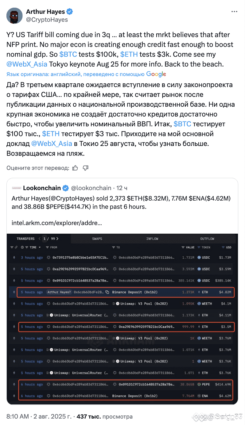 Артур Хейс ожидает, что из-за пошлин США BTC оттестирует 100 000$, а ETH - 3 000$.
