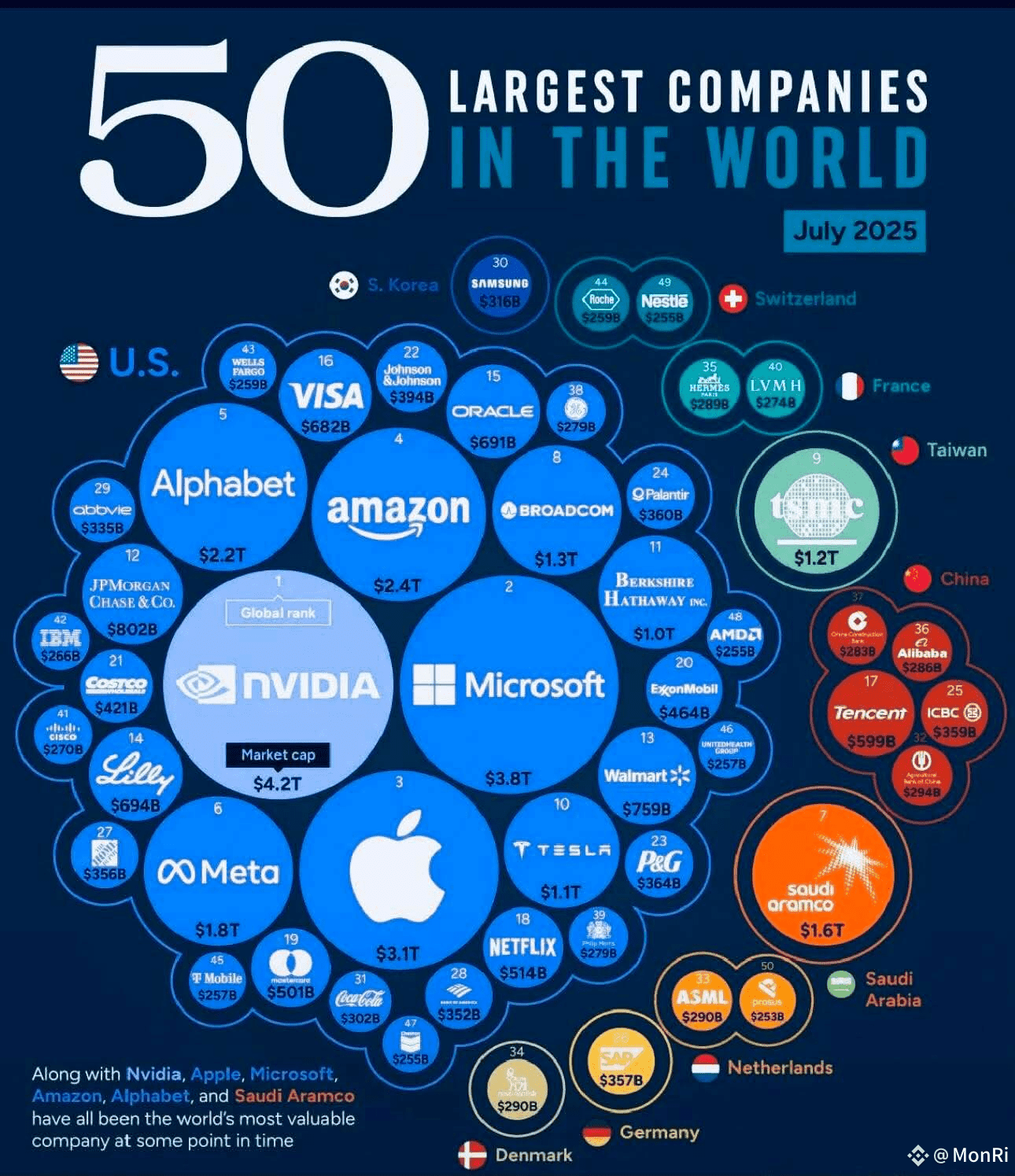 There are 34 American companies in the top 50. Saudi Aramco is the largest company outside the United States with a market cap of $1.6 trillion.