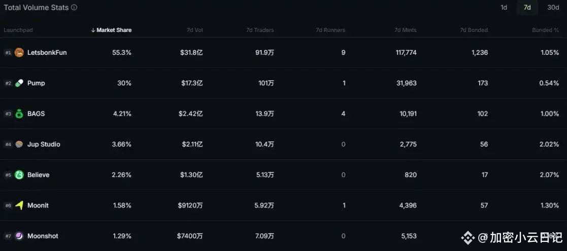 回到Letsbonk.fun,这个平台在过去的一个月内始终占据市场份额的半壁江山,并且在过去7天的表现也一直保持领先地位。特别是在$Ani这一热点项目爆发后,Letsbonk.fun 再次展示了它强大的市场号召力。