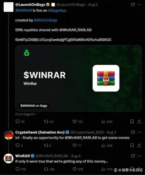 另一个引起关注的代币 $WINRAR 就是把代币收入直接指派给了大家几乎都用过的压缩包应用 WinRAR 的官推。这吸引到了 WinRAR 官推的回复。