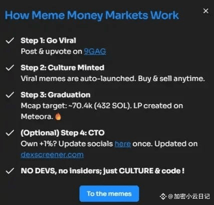 Moonit 则采用了一个相对更具未来感的方案,它结合了 AI 技术与 Meme 币的发射,能够根据社交平台 9GAG 上的热门 meme 自动生成代币。