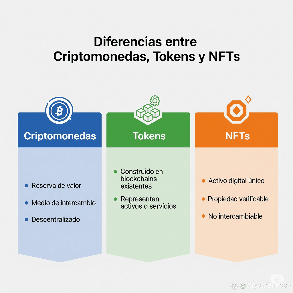 CaracterísticaCriptomonedasTokensNFTsBlockchain propiaSíNoNoFungibilidadFungiblesFungiblesNo fungiblesFunción principalDinero digitalUsos variadosPropiedad digital únicaEjemplosBTC, ETH, BNBUSDT, AAVEBored Ape, CryptoPunks
