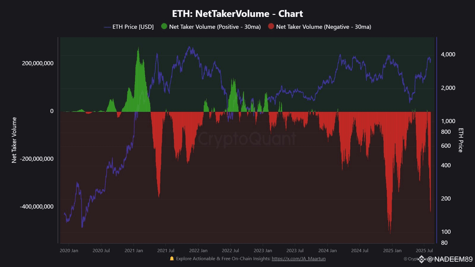 Another CryptoQuant analyst, Maartunn, highlighted a different indicator that reflects short-term market pressure on Ethereum. According to his data, Net Taker Volume for ETH stood at -$418.8 million daily.
