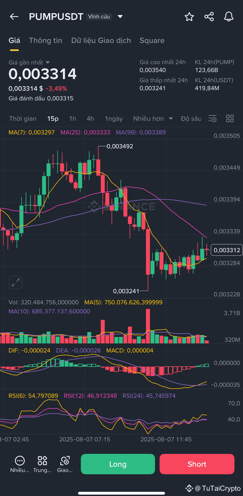 Khung 1h cho thấy PUMP đang cố gắng bật lại sau khi chạm đáy 0.003241. Cây nến gần nhất đã thu hẹp độ giảm, RSI(6) đang ở mức 41 – cho thấy đà bán đã yếu dần, có dư địa hồi.