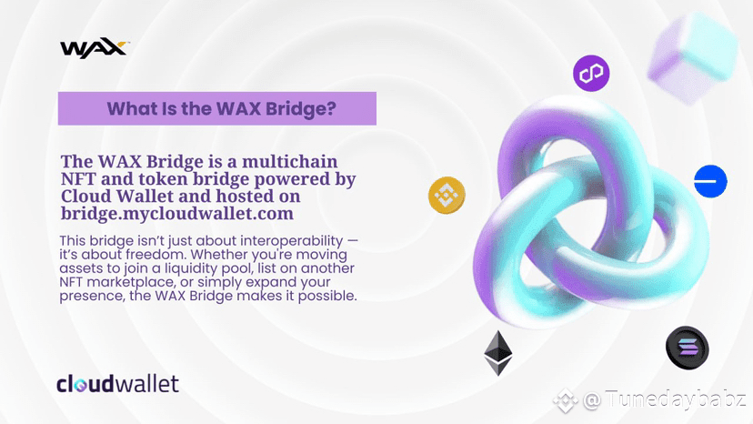 Hosted at bridge.mycloudwallet.com, the WAX Bridge is a multichain NFT and token bridge powered by Cloud Wallet. This multi-chain NFT & Token Bridge is designed to break down the barriers between blockchain ecosystems, connecting WAX to a growing suite of popular chains including Ethereum, Binance Smart Chain (BNB Chain), Polygon, Solana, and Base Chain— giving creators, traders, and gamers greater flexibility and reach.