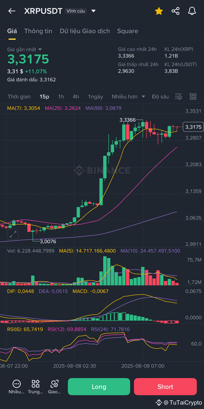 Nhìn vào chart $XRP dạo gần đây, mình thấy em nó vừa có cú bứt phá cực đã mắt, phi một mạch từ vùng 2.9630 lên tận 3.3366, nhanh gọn như một pha nước rút về đích. Giờ thì giá đang nhẹ nhàng lùi về quanh 3.31 – trông như đang nghỉ lấy hơi, nhưng biết đâu lại là bước lùi để chuẩn bị cho cú bật tiếp theo. Cùng mình “zoom” kỹ từng khung thời gian để xem chuyện gì đang chờ phía trước nhé.