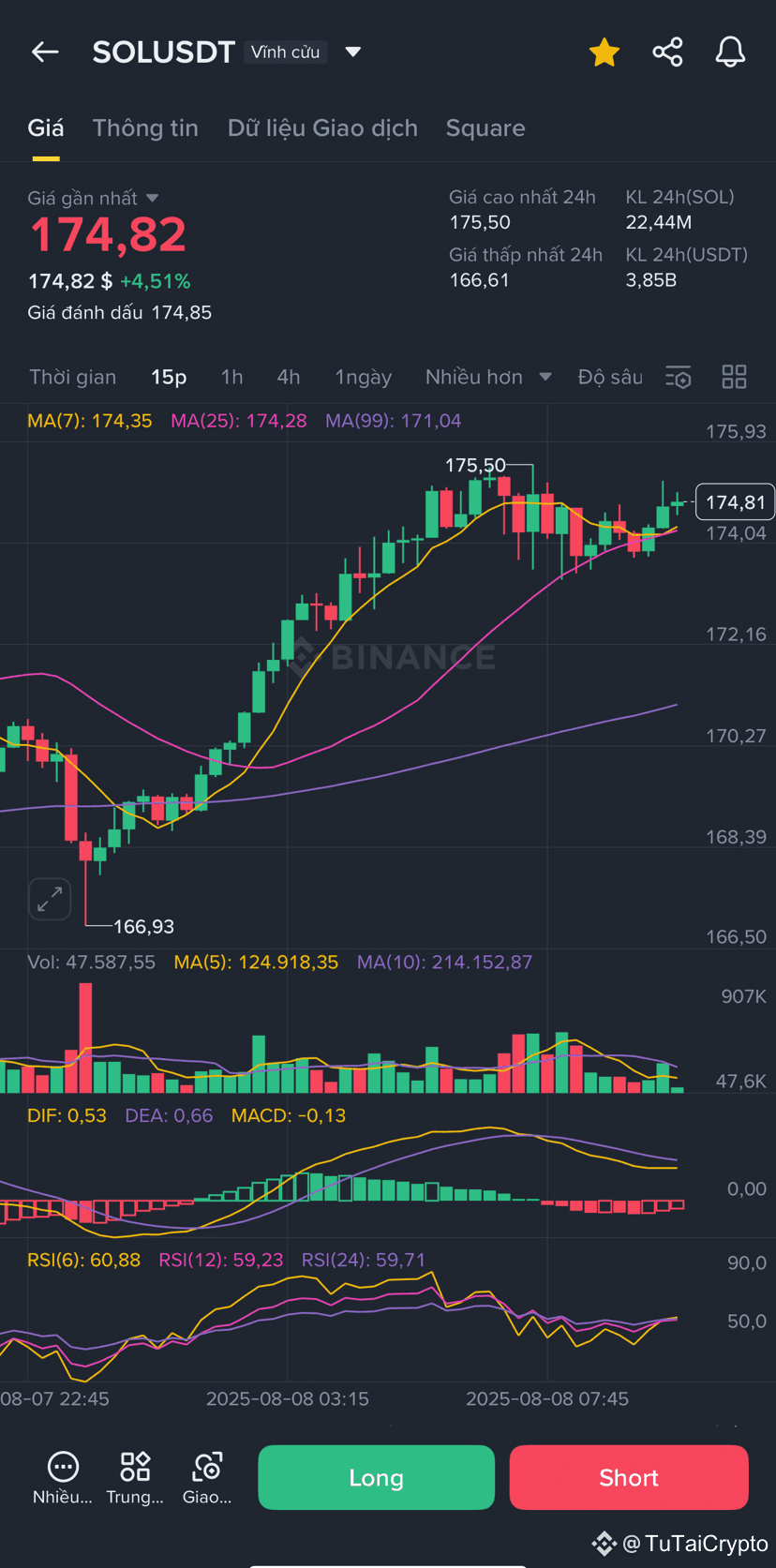 Trên khung 4h, SOL bật mạnh từ 155 lên 175 rồi điều chỉnh nhẹ về gần MA7 (171), giữ trên cả MA25 (167) → cấu trúc tăng vẫn ổn.