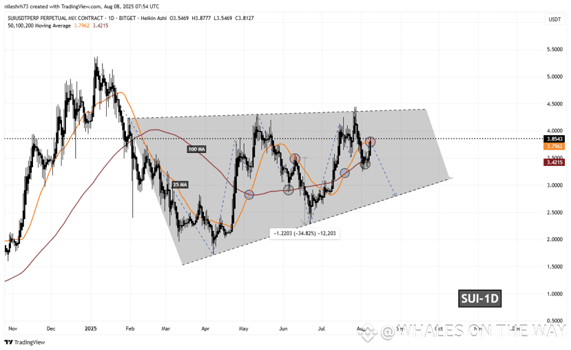 However, if bulls manage to hold the 25-day MA, this would invalidate the bearish scenario and signal strength. In this case, SUI could climb higher, potentially retesting the upper resistance of the wedge around $4.40.