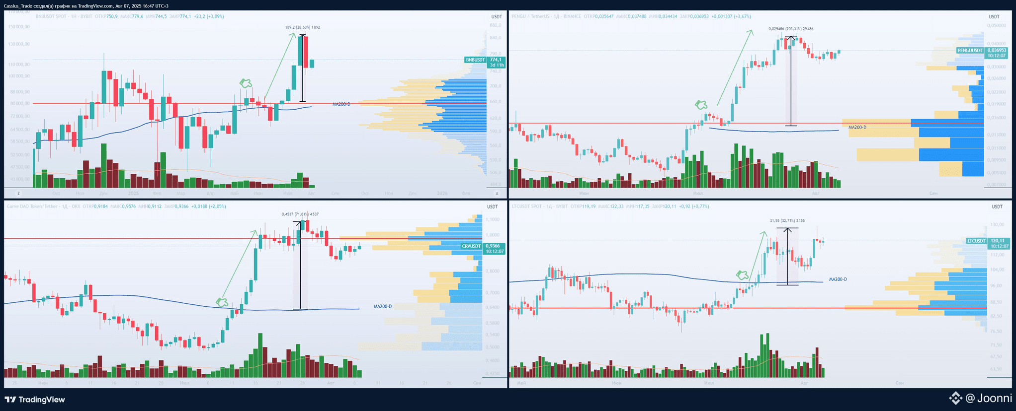 📍 На картинке ниже мы показали живые примеры: $BNB , $PENGU , $CRV , LTC.