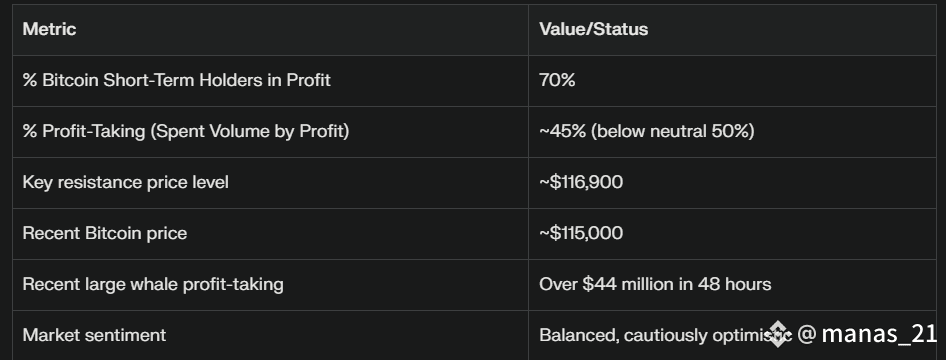 On-chain analytics from Glassnode reveal that 70% of Bitcoin short-term holders (STHs) are currently in profit despite a recent Bitcoin price pull-back from mid-July highs around $123,100 to levels near $115,000. These short-term holders are defined as investors who acquired Bitcoin within roughly the last 155 days.
