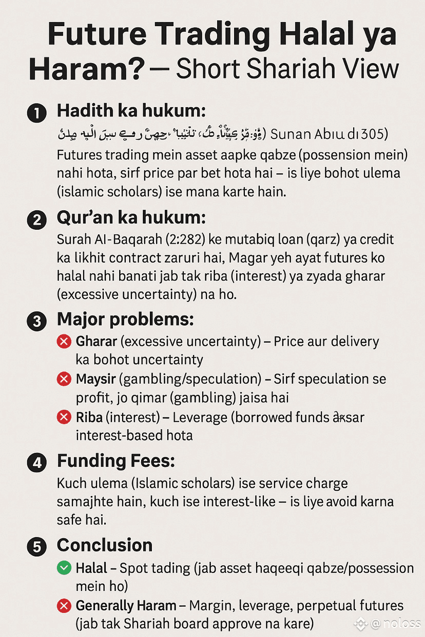 Futures trading mein asset aapke qabze (possession) mein nahi hota, sirf price par bet hota hai — is liye bohot ulema (Islamic scholars) ise mana karte hain.