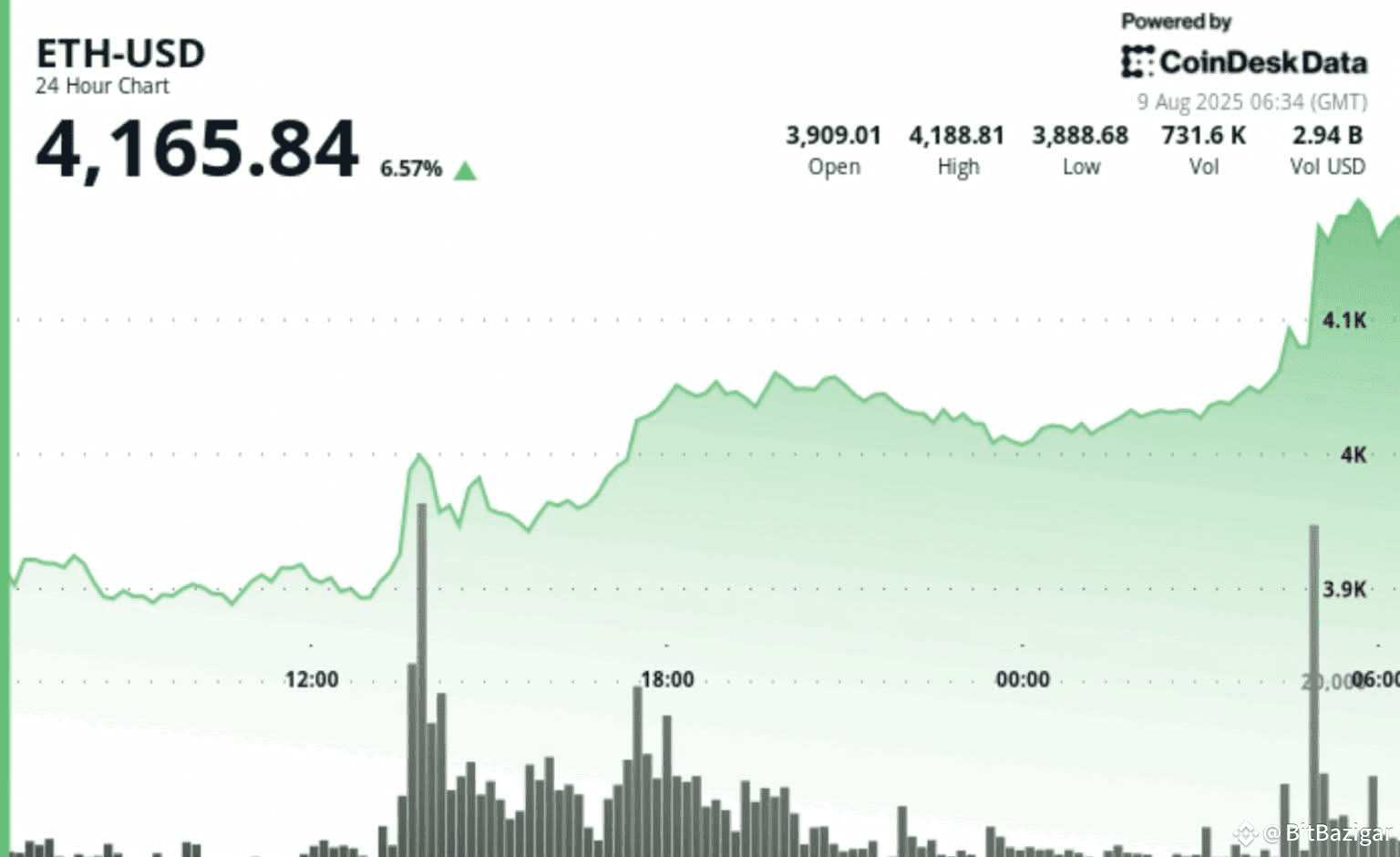 Technically, ETH rose from $3,914.59 on August 8 to $4,160.29 on August 9, with trading volume tripling. The rally came from two major breakouts, peaking above $4,190 before pulling back slightly due to profit-taking. Current market signs point to consolidation, and analysts urge caution due to potential volatility.$ETH