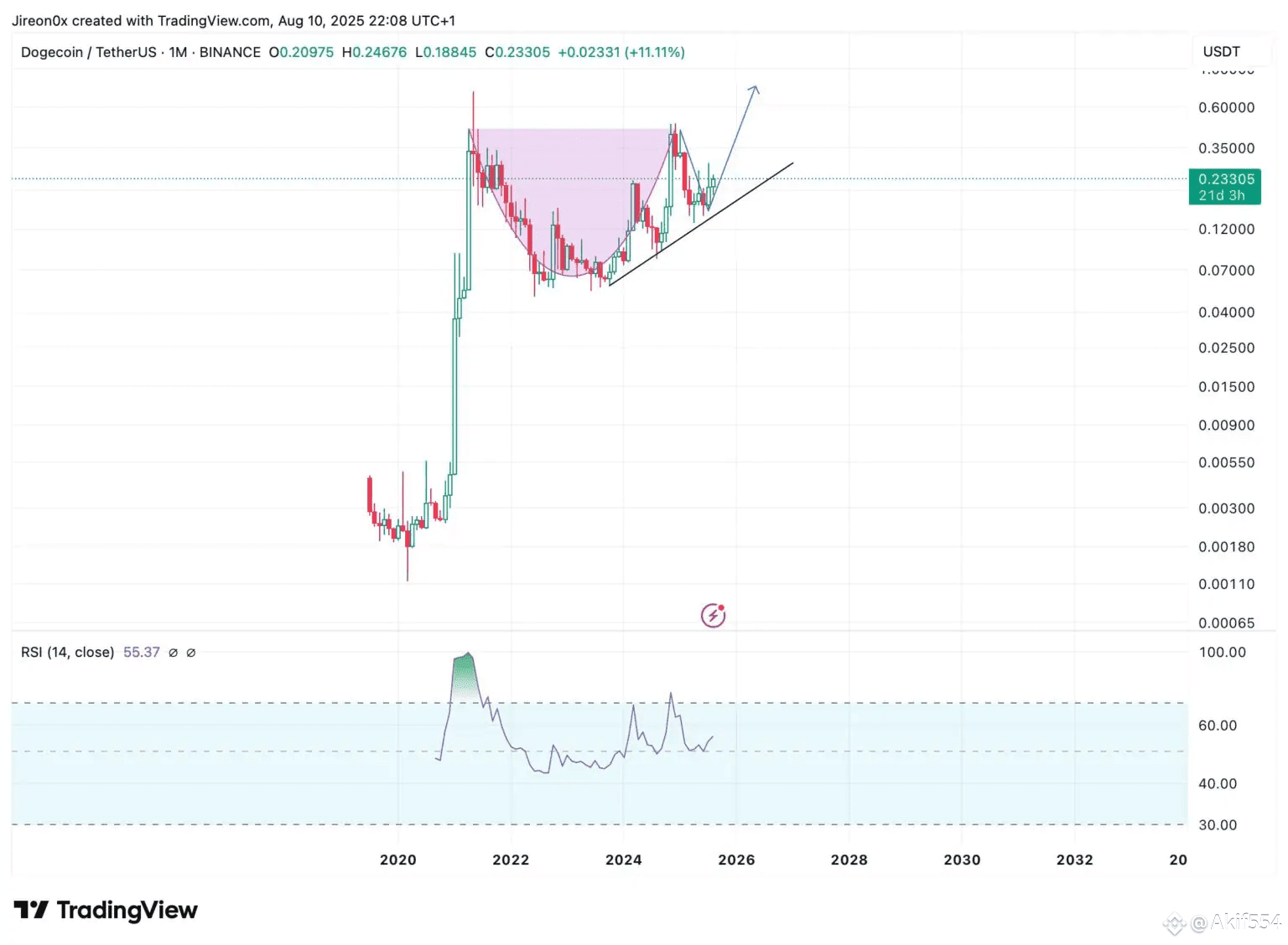 Technical traders see a bullish pattern forming on the monthly chart. Market analyst Jireon points to a classic “cup and handle” setup, noting that DOGE has been establishing higher lows, a structure often associated with significant upside potential.