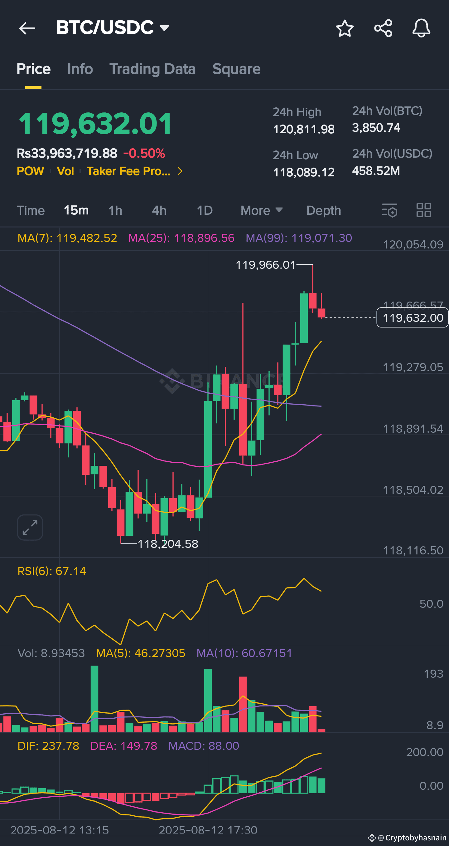 Bitcoin is trading around $119,700, pulling back slightly from its recent highs near $120,700. Macro sentiment is mixed — U.S. July CPI data came in higher than the Fed’s 2% target, which could delay interest rate cuts. This usually strengthens the USD and can weigh on BTC, but institutional inflows and policy moves supporting crypto adoption have helped BTC maintain its bullish structure.
