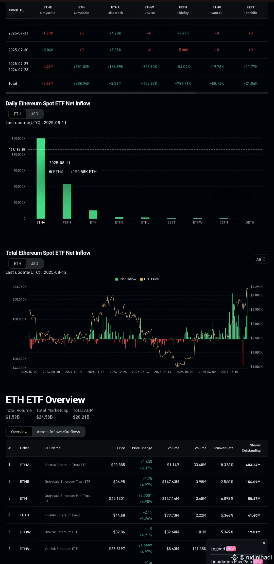 Momentum ini berlanjut ke Agustus: pada 11 Agustus 2025, ETF ETH mencatat inflow harian tertinggi sejak diluncurkan lebih dari US $1 miliar dalam sehari. Produk milik BlackRock (ETHA) memimpin dengan US $639 juta, diikuti oleh Fidelity (FETH) sebesar US $277 juta.
