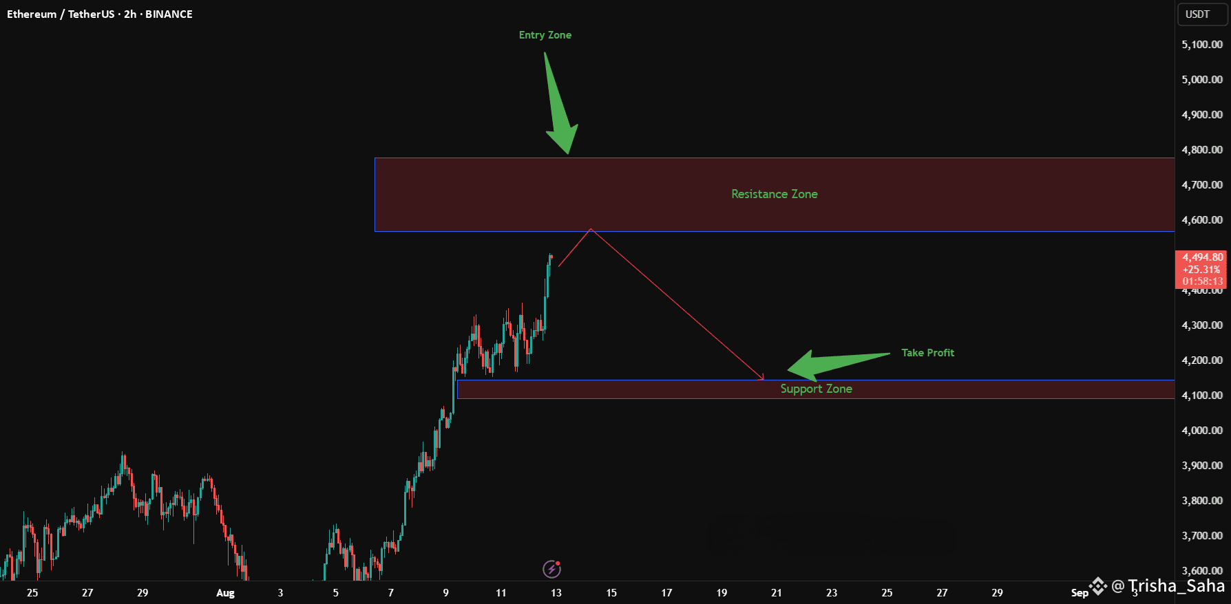 ETHUSDT is flashing warning signs on the 2-hour chart, with an entry zone between 4570-4780 near a critical resistance level that has capped recent rallies.