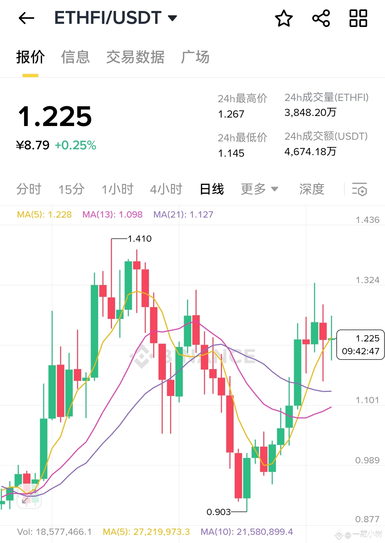 后面不死心又再次杀回来了,当时买的是ETHFI,以太的DeFi嘛,怎么都得看在这个因素涨不少吧,实际情况是没有,跌跌不休,一直补仓,终于在24年国庆解套离场,还赚到不少。