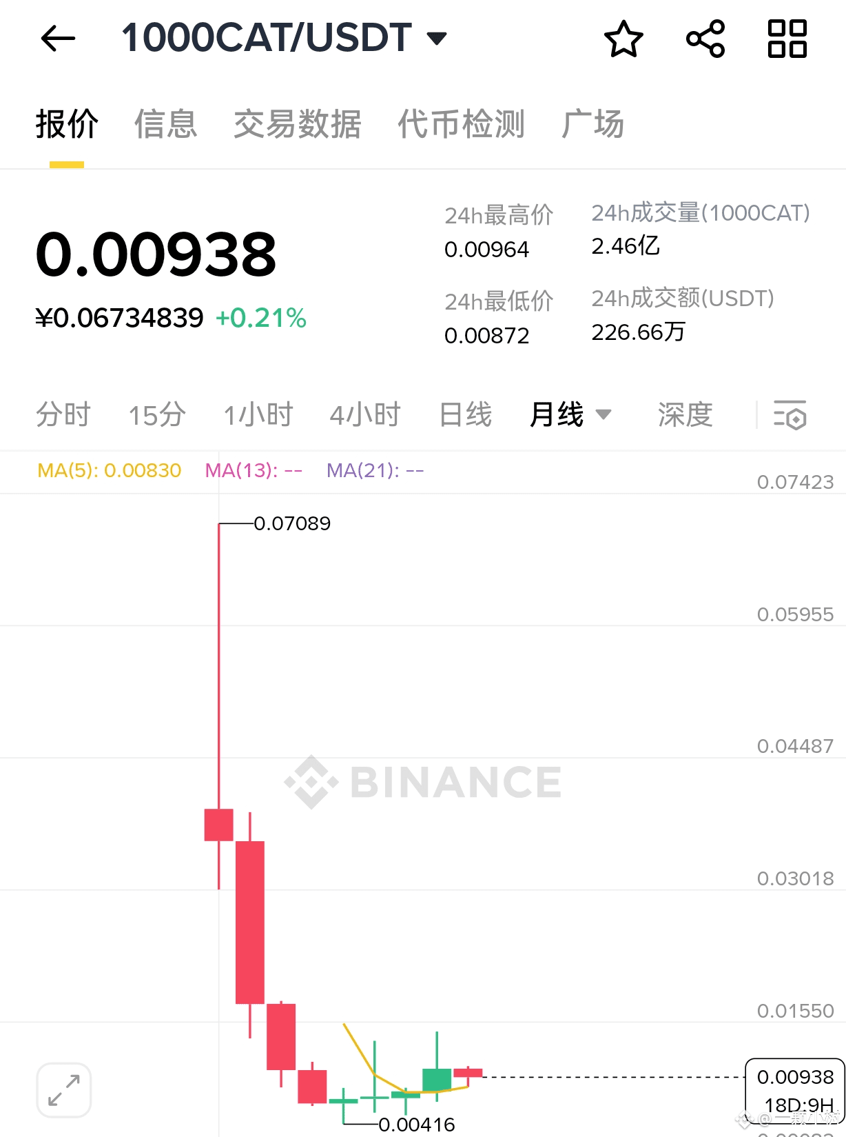 还有一件事是买入1000cat在新币上市的时候,那个时候出来创业了,家里给了点钱。我想着砸入加密市场赚多点创业资金,在吃到第一波上涨的甜头时果断等他回落入场,看1000cat的走势图,各位能看到我的经历,补仓补仓再补仓、腰斩腰斩再腰斩。当时天真的以为西蒙的猫的知名IP会助力他的腾飞,可直至今日我也丝毫看不到他起飞的痕迹(已全清仓)。