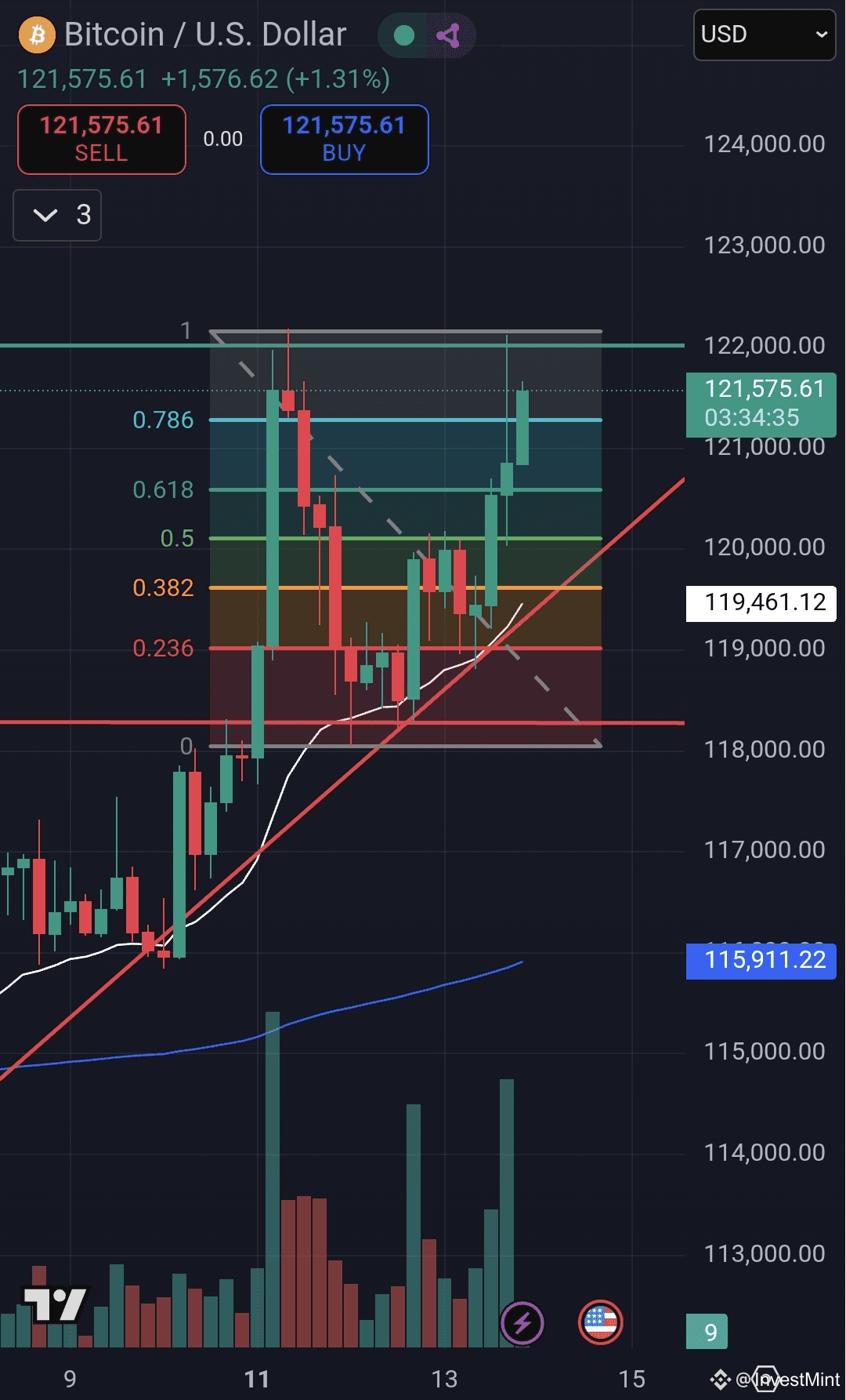 * Price is now testing above the *0.786 Fibonacci retracement** ($121,150).