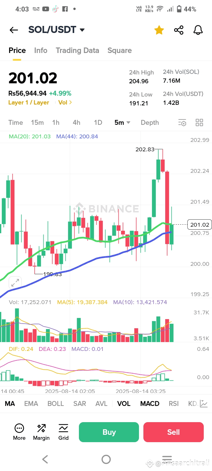 As of 4:03 AM PKT on August 14, 2025, SOL/USDT stands at $201.02, reflecting a +4.99% gain (Rs566,944.94). The 24h high of $204.96 and low of $191.21, coupled with a 7.16M SOL volume, indicate robust buying pressure. The 20-day MA ($201.03) and 44-day MA ($200.84) are converging, supporting a steady uptrend. The MACD shows a bullish crossover (DIF: 0.24, DEA: 0.23, MACD: 0.01), while the RSI remains in a healthy 50-60 range, suggesting room for growth before overbought conditions.