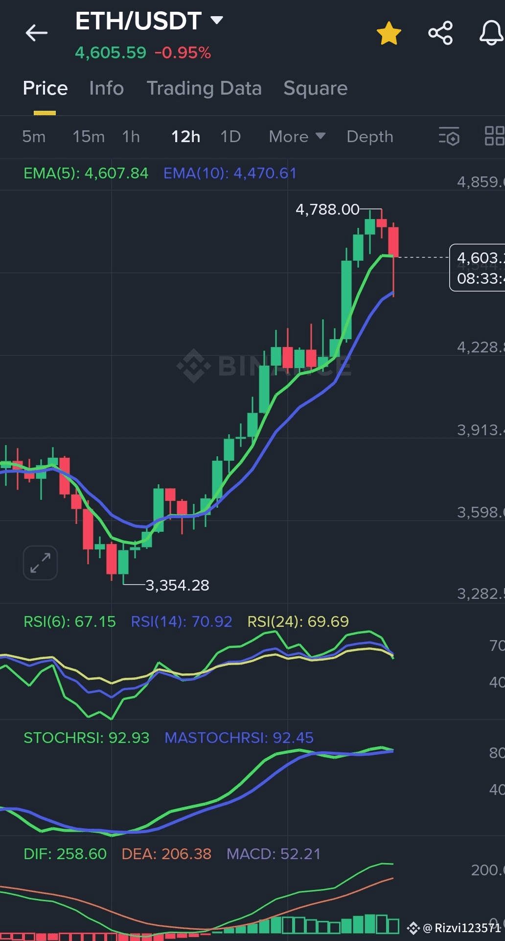 ETH recently pulled back from the $4,788 high to $4,603 — a healthy correction after a strong rally. Despite the dip, momentum remains bullish.