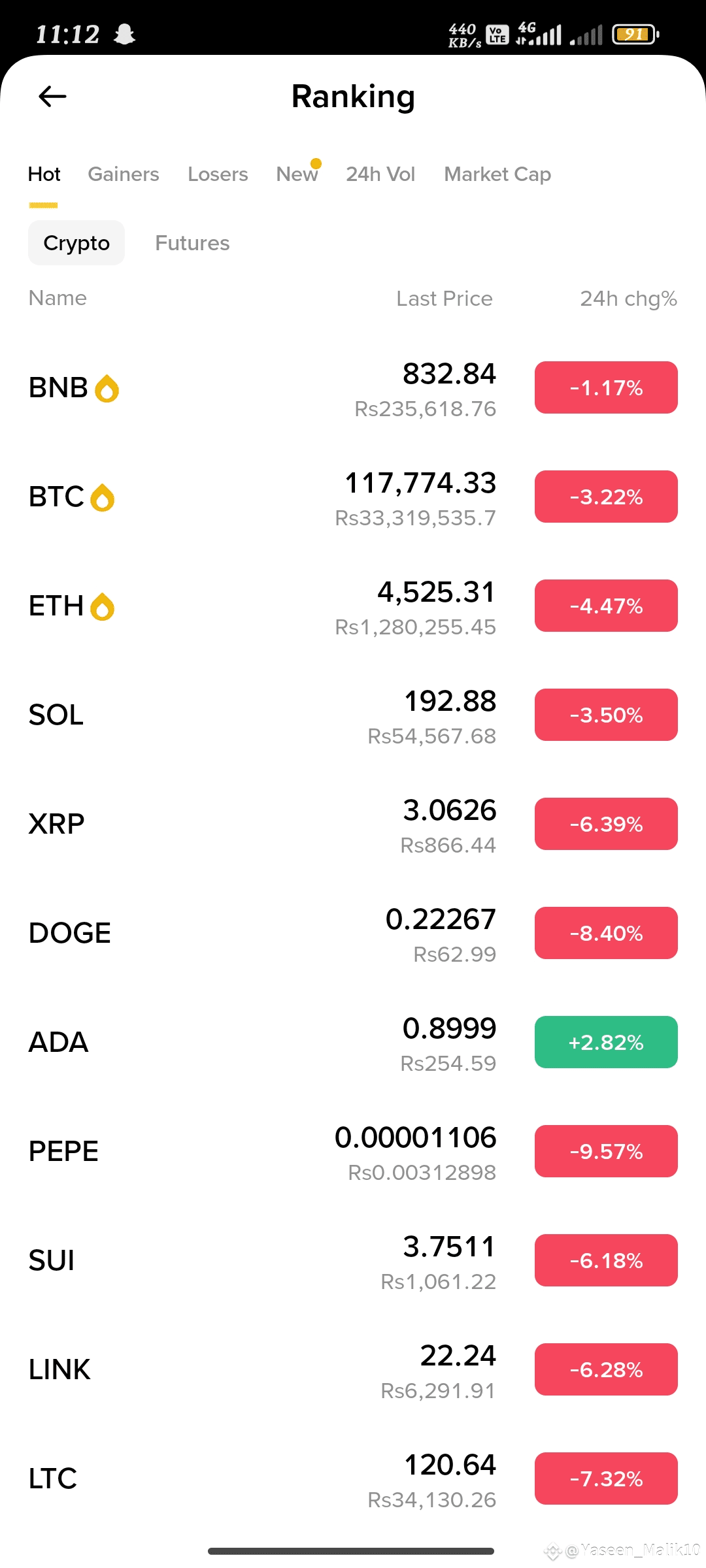 Smaller-cap assets were not spared from the sell-off. PEPE witnessed the largest single-day percentage decline, tumbling 9.57% to $0.00001106 (₨0.00312898). SUI fell 6.18% to $3.7511 (₨1,061.22), Chainlink (LINK) shed 6.28% to $22.24 (₨6,291.91), and Litecoin (LTC) lost 7.32%, trading at $120.64 (₨34,130.26).