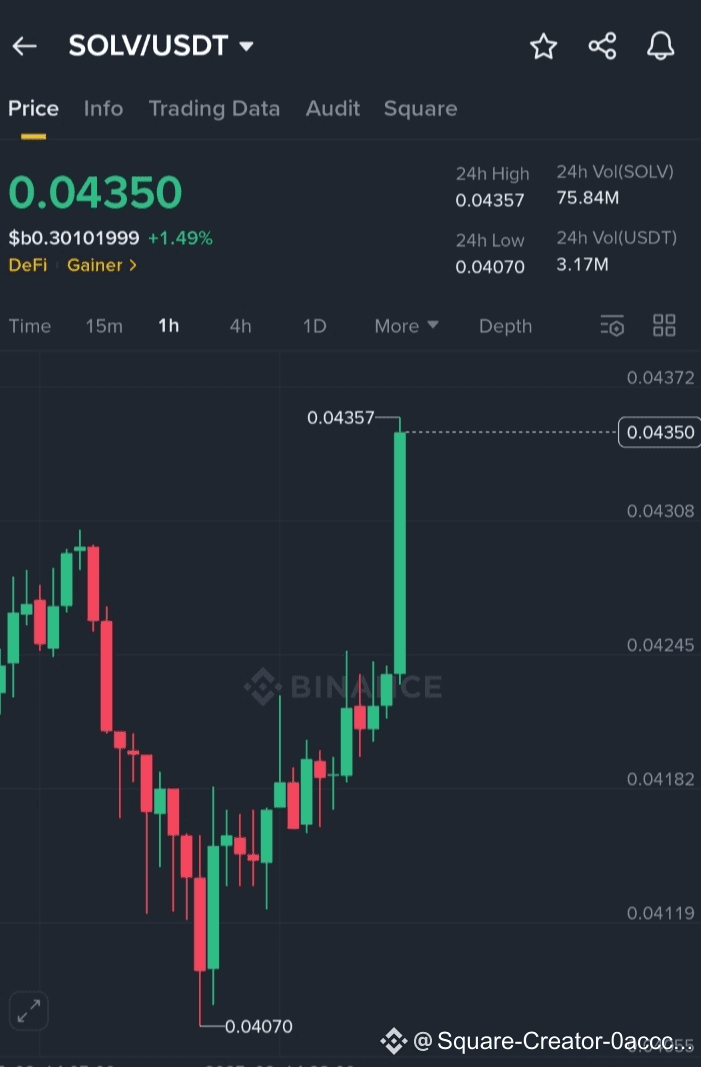 لقد ارتفع SOLV من دعم 0.04070 وهو الآن يتداول عند 0.04350، مما يظهر زخمًا صعوديًا قويًا. يشير الاختراق إلى 0.04357 إلى تحول واضح في الاتجاه، مع سيطرة المشترين بشكل راسخ. إذا ظل الحجم قويًا، فقد تستهدف المنطقة المحتملة التالية للصعود 0.04420 وما فوق.