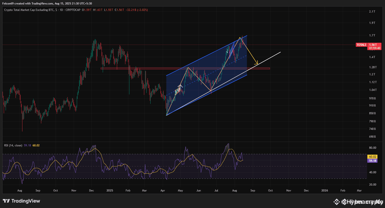 The projected correction could pull TOTAL2 down toward the $1.2 trillion support zone, where previous resistance meets the lower trendline ⬇️.