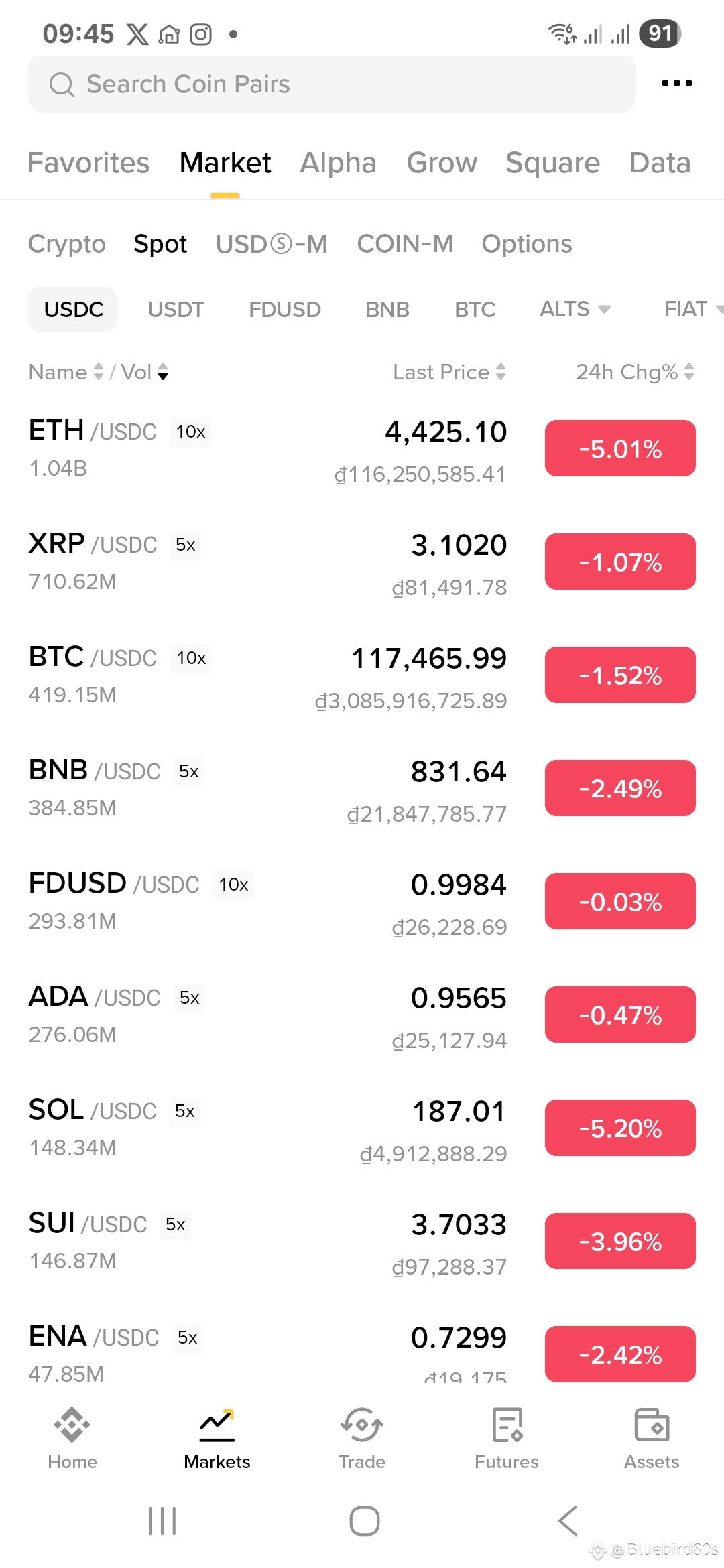Based on the image provided, it's clear the crypto market is experiencing a downturn today, with most major assets showing negative 24-hour change percentages.