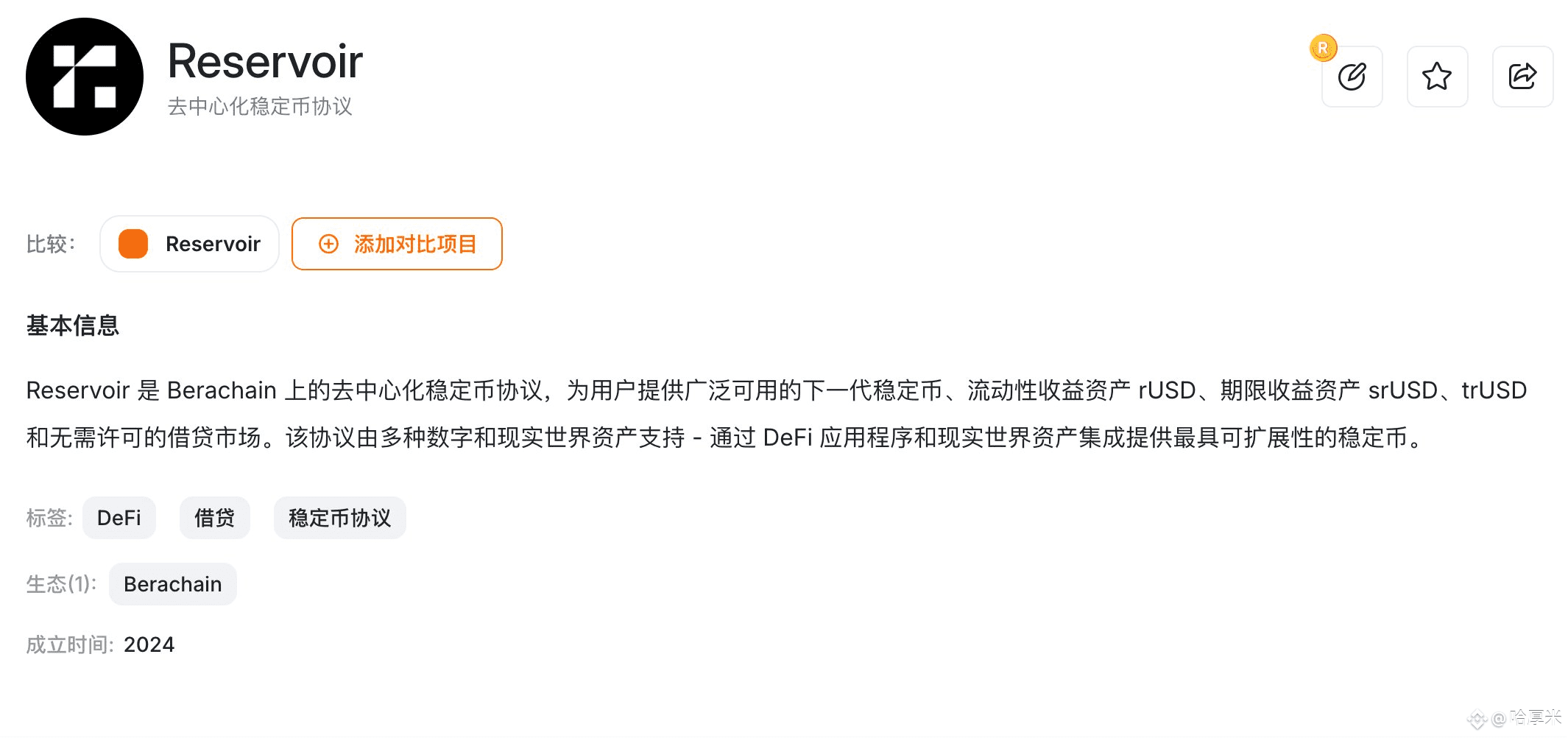 项目介绍:Reservoir 是 Berachain 上的去中心化稳定币协议,为用户提供广泛可用的下一代稳定币、流动性收益资产 rUSD、期限收益资产 srUSD、trUSD 和无需许可的借贷市场。